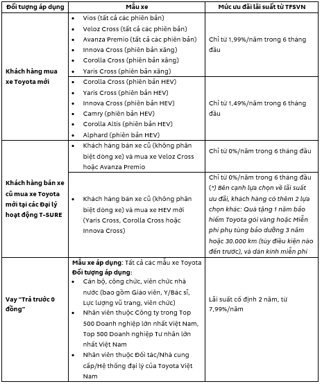 Ngoài ra, trong tháng 12/2025, Công ty tài chính Toyota Việt Nam (TFSVN) cũng thực hiện chương trình ưu đãi cho các khách hàng vay mua xe với mức lãi suất ưu đãi hấp dẫn: